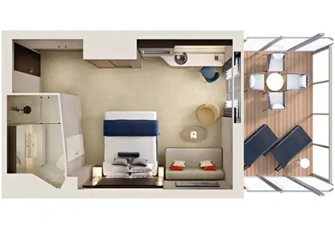 | B1 - Kajuta s veľkým balkónom Aft-facing 21 m² / balkón 8 m². 7. až 10. paluba - vzadu. Max 3 osoby. | 7 190 € 3 595 € za osobu | ||
