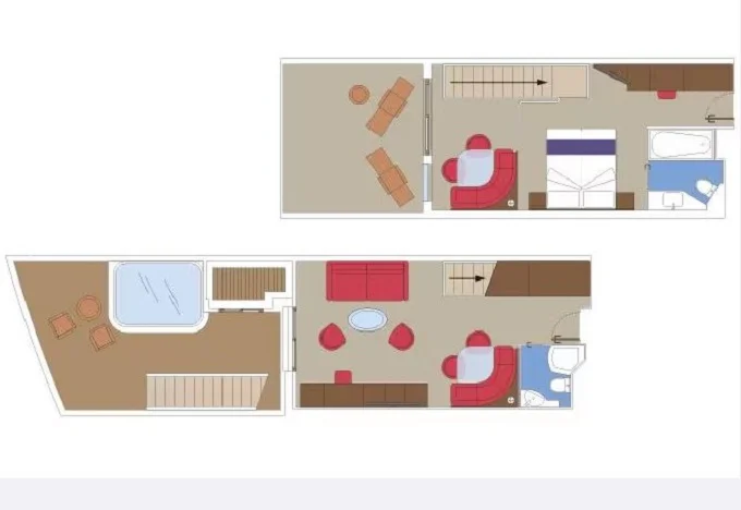 | YCD - Yacht Club Duplex Suite 46 m² + balkón 6 m². 2 podlažia, 2 kúpeľne (1 s vaňou) Max 4 osoby. 16. paluba. Cenový model MSC Yacht Club. | 6 982 € 3 491 € za osobu | ||