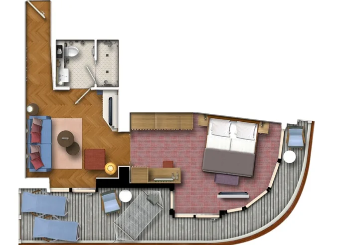 SKZO - Horizont Suite 38-40 m² + balkón 16 m² s ležadlami a hojdacou sieťou. Obývacia časť a oddelená spálňa. 7-8. paluba. Max 4 osoby. Výhody Suite. 16 856 € 4 214 € za osobu