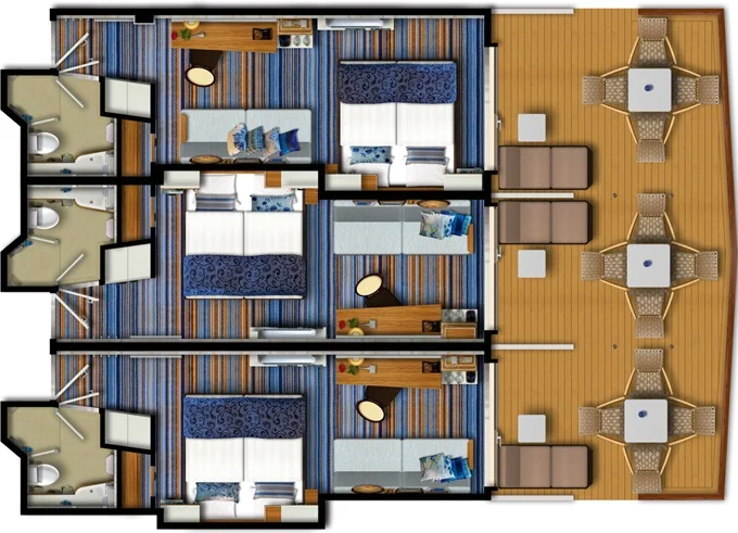 | VEPO - Kajuta s terasou Premium 17 m² + balkón 30 m² s 2 kreslami, 2 ležadlami a hojdacou sieťou. 7-11. paluba. Max 3 osoby. | 12 648 € 4 216 € za osobu | ||