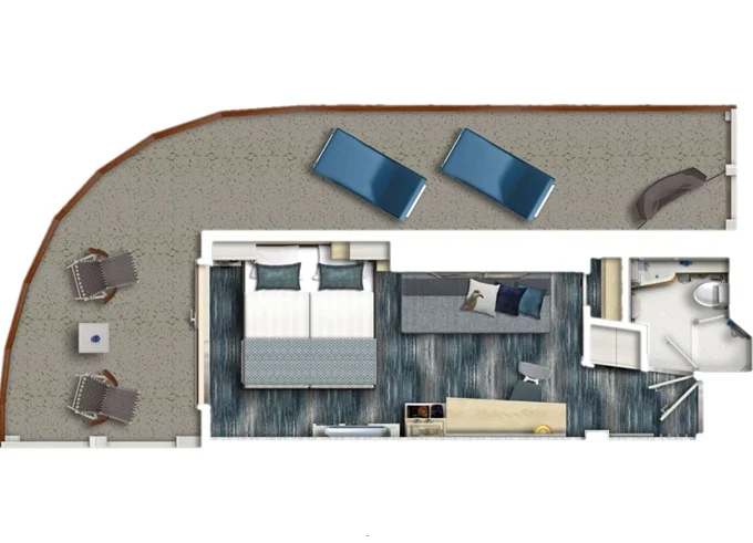 SUHO - Himmel & Meer Suite 42 m² + prekrytá terasa 29 m² na poschodí so stolom, ležadlami a s hojdacou sieťou. 15. paluba. Max 4 osoby. Výhody Suite. 17 286 € 5 762 € za osobu