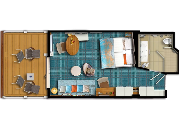 | VEPO - Kajuta s terasou Premium 17 m² + balkón 30 m² s 2 kreslami, 2 ležadlami a hojdacou sieťou. 7-11. paluba. Max 3 osoby. | 4 238 € 2 119 € za osobu | ||