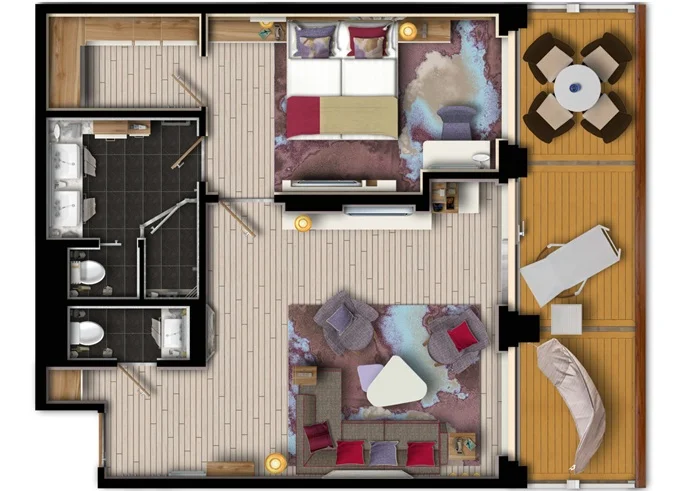 | SUTO - Themen Suite 54 m² + balkón 15 m² so stolom, ležadlom a hojdacou sieťou. Spálňa, obývacia časť, šatník. 10. paluba. Max 4 osoby. Výhody Suite. | 9 528 € 3 176 € za osobu | ||