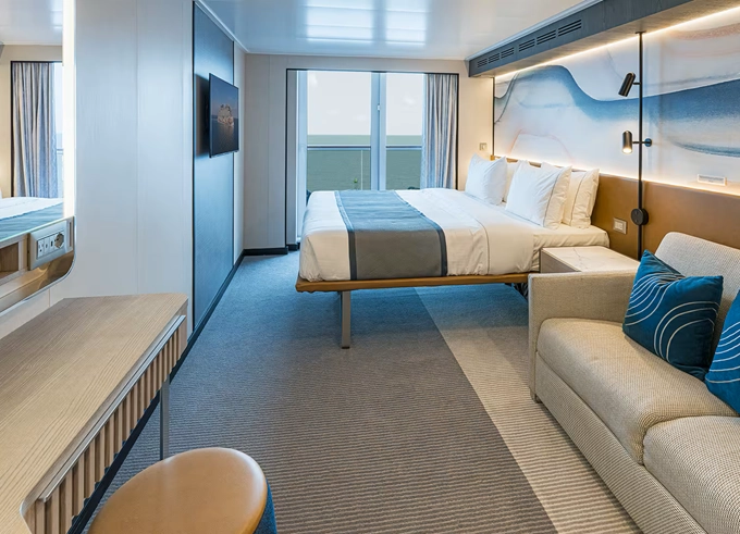 MB - Club Suite Forward-Facing s balkónom 22 - 25 m² / balkón 7 m². 9. až 13. paluba - vpredu. Max 2 osoby. Výhody Club. 5 204 € 2 602 € za osobu